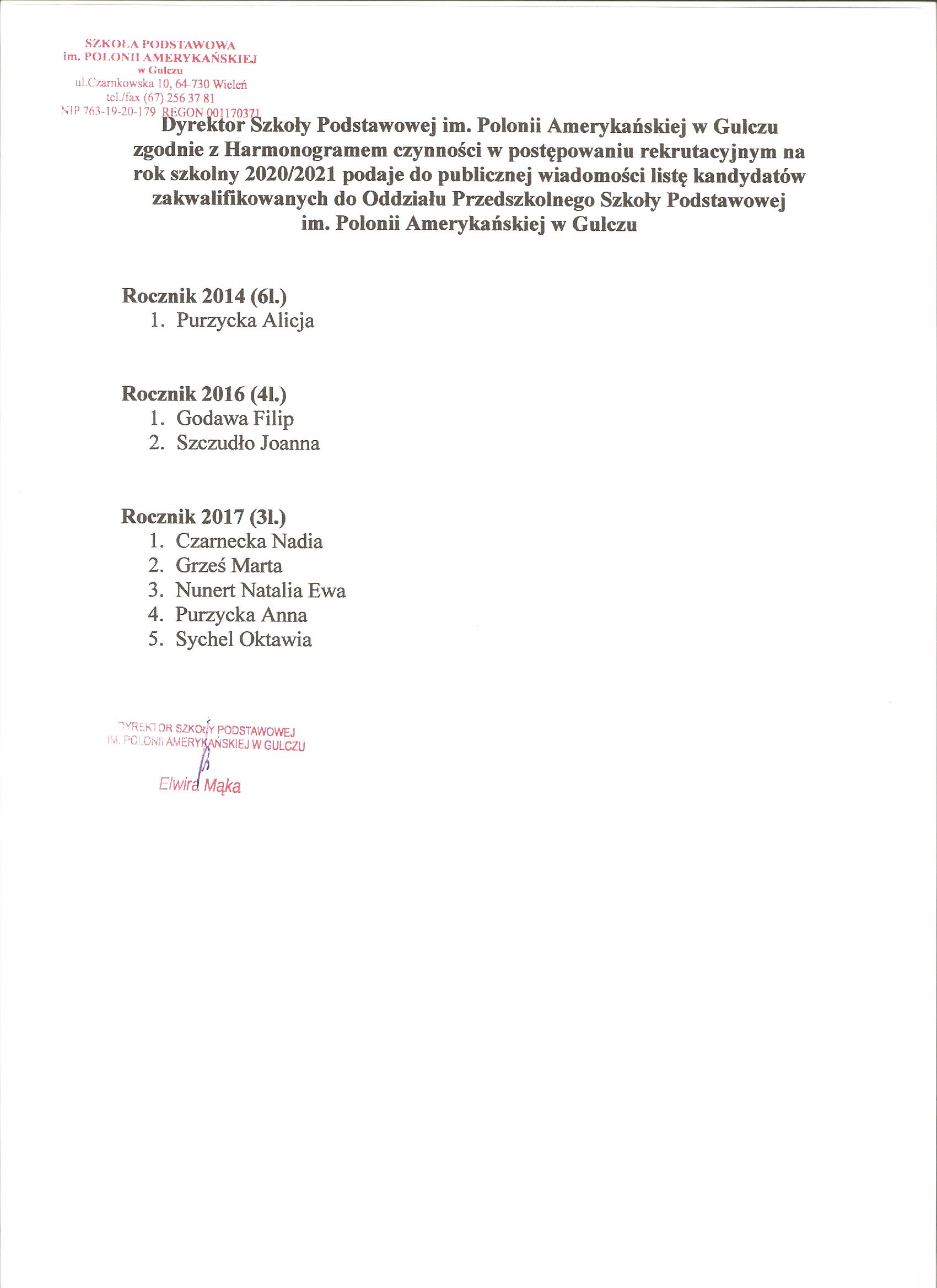 Zgodnie z harmonogramem czynności w postępowaniu rekrutacyjnym oraz postępowaniu uzupełniającym na rok szkolny 2020/2021 do przedszkola i oddziałów przedszkolnych w szkołach podstawowych, dla których gmina Wieleń jest organem prowadzącym, od 24. 03.2020 do 30.03.2020 rodzice zobowiązani są złożyć pisemne oświadczenie woli przyjęcia kandydata do oddziału przedszkolnego.
